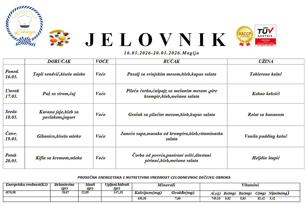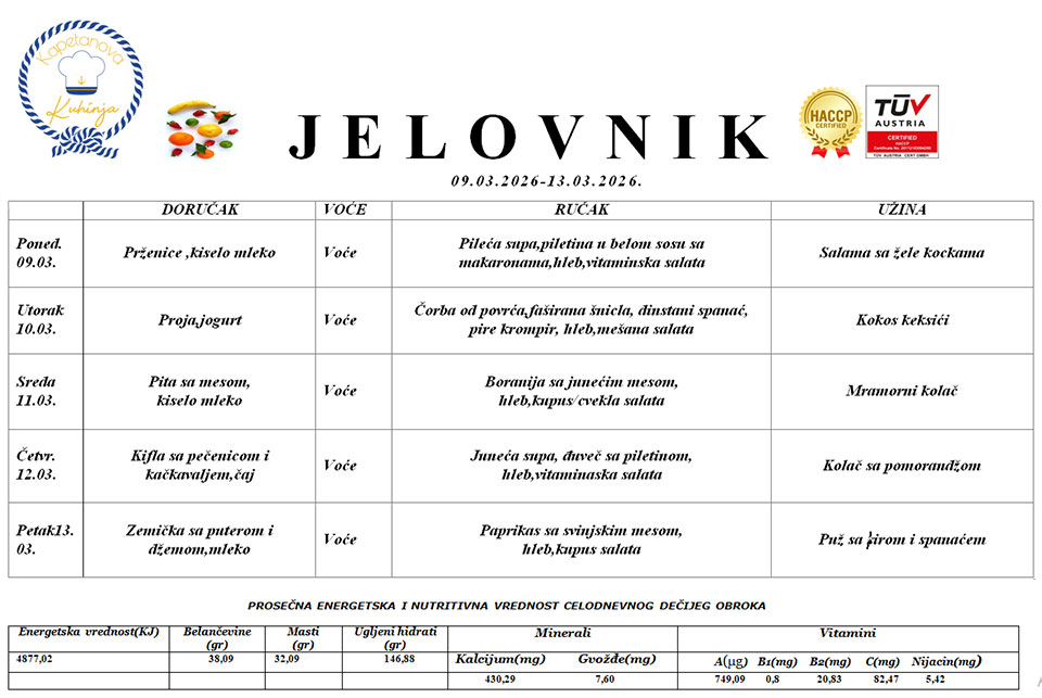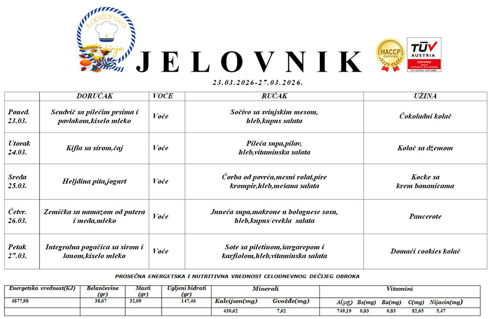 Naša sertifikovani i licencirani partner „Kapetanova Kuhinja“ je nastao iz potrebe da se deci obezbedi obrok koji je planiran tako da zadovoljva energetske potrebe dece.